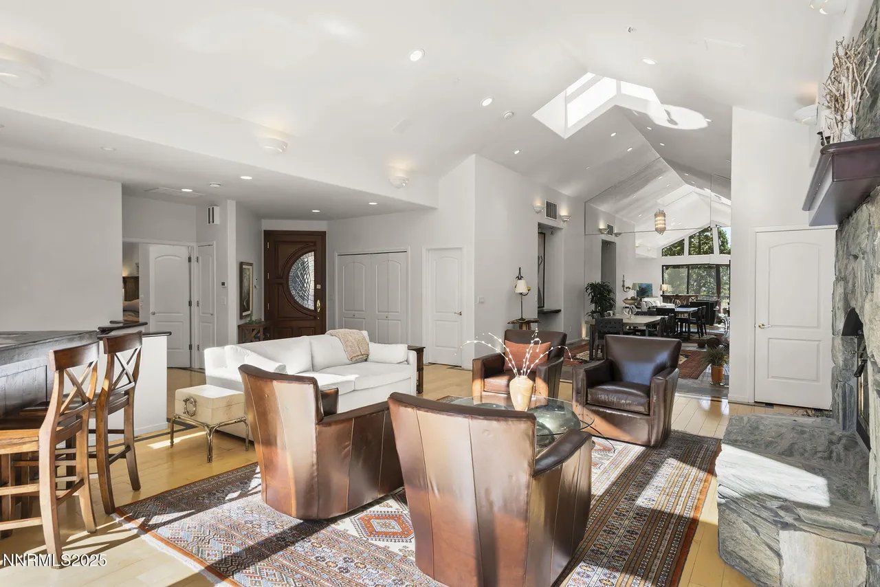 The main level welcomes you with soaring vaulted ceilings, skylights that flood the space with natural light, and a warm river rock fireplace with insert.